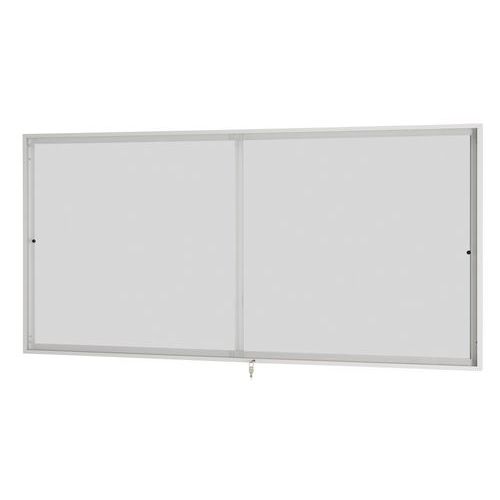 Binnenvitrine met frame van geanodiseerd aluminium voor de presentatie van berichten en aanwijzingen in ontvangstruimtes. Schuifdeuren van plexiglas van 4 mm, handig voor weergave in gangen of smalle doorgangen. Grijze magnetische achterwand voor de weergave van uw documenten met magneten.