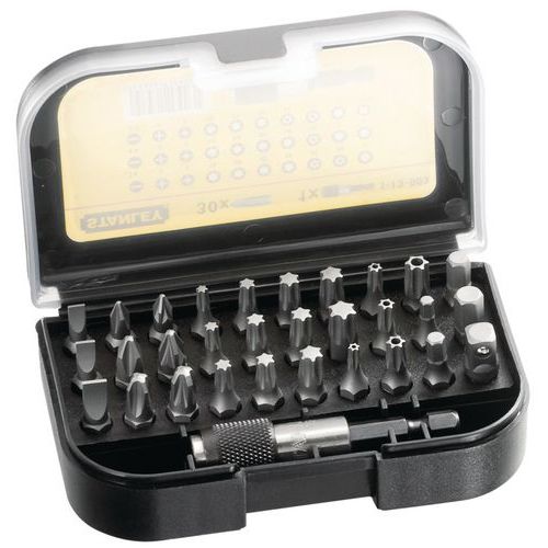 - Koffer met 30 schroefbits (sleuf, Phillips, Pozidriv, Torx, zeskant) en 1 bithouder.