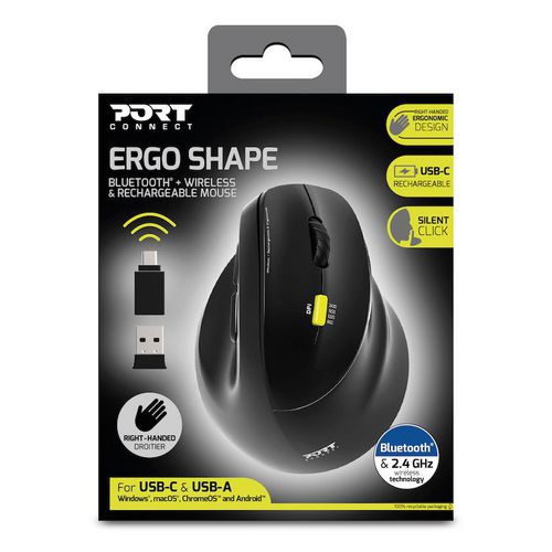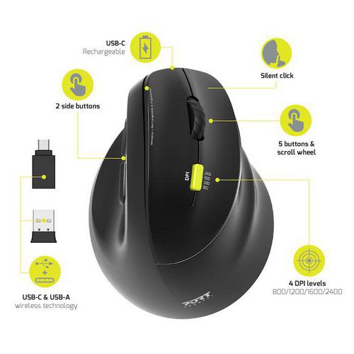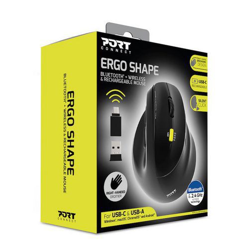 - Ergonomische muis met hellend ontwerp voor een natuurlijke houding van de hand.