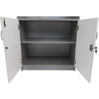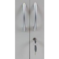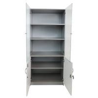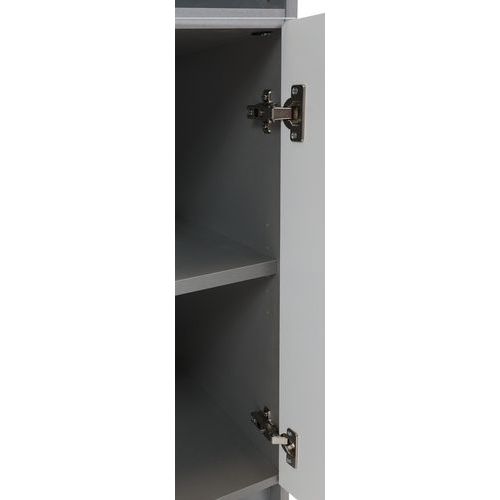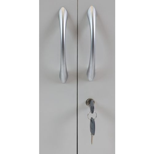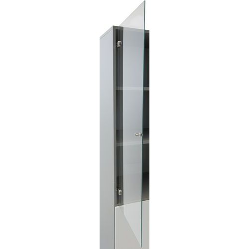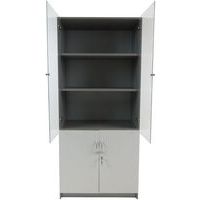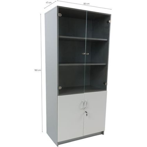 Constructie van spaanplaat. L/H/D: 80 x 180 x 47 cm. Bruikbare breedte 76 cm. Glazen deuren zonder slot. Lage deuren met sleutelslot (2 sleutels meegeleverd). Metalen handgrepen in kleur aluminium op lage deuren. Bovenzijde: 3 legborden waarvan 2 vaste. Onderzijde: 1 verstelbaar legbord. Max. gewicht per legbord: 35 kg verdeeld. Stelpoten vanaf binnenzijde af te stellen. Monteerklaar geleverd met handleiding.