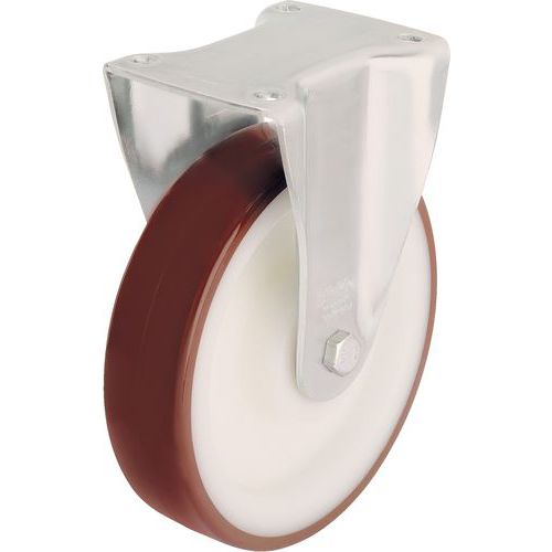 - Bokwiel met gaffel in dik diepgetrokken plaatstaal, geschikt voor middelzware belasting.