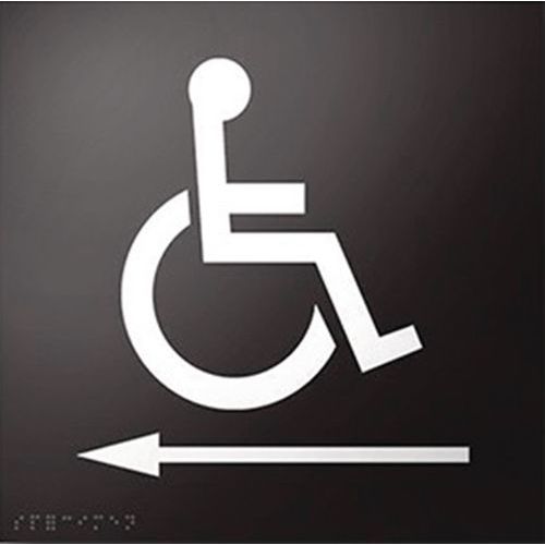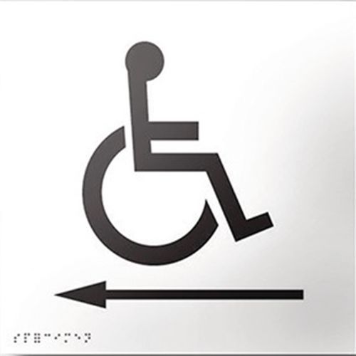 | Productnaam | Bord picto rolstoel pijl links in relief en braille, Zelfklevend: ja, Materiaal: ABS, Type bord: Indicatie |