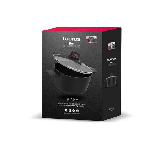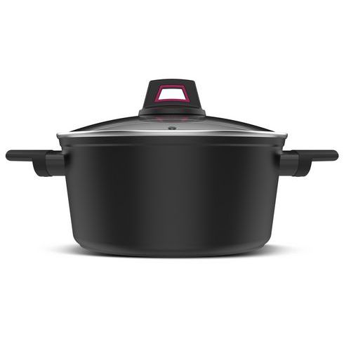 Gesmeed aluminium. Diameter: 20 tot 28 cm. Geschikt voor alle soorten fornuizen inclusief inductie. Deksel met siliconen afdichting. Anti-aanbaklaag. Ergonomische handgreep. Zonder PFOA. Geschikt voor de vaatwasser.