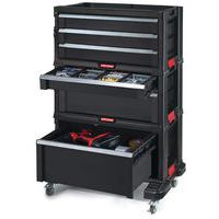 - Mobiele dubbele gereedschapskoffer van duurzame kunststof voor het opbergen van gereedschap in de werkplaats. Verwijderbare koffers, opbergvakken in het deksel en schuifbakken met deksel. Eenvoudig te hanteren dankzij de wielen en de uittrekbare kunststof handgreep.