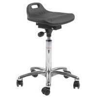 - Kruk met wielen met stalen basis met voetensteun en zitting van polyurethaan, kunststof, gelakt multiplex of gevoerd met schuimrubber.