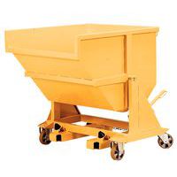 - Zelfkantelende kiepcontainer met beperkte hoogte op wielen voor eenvoudig en veilig transport.
