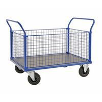 Plateauwagen met gaas aan drie kanten, ontworpen voor materiaaltransport in industriële omgevingen.