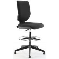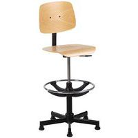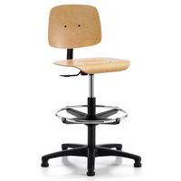 - Hoge of zitten-staan werkplaatsstoel met middelhoge rugleuning, in hoogte verstelbaar via tandheugel.