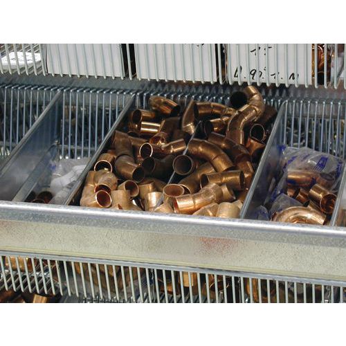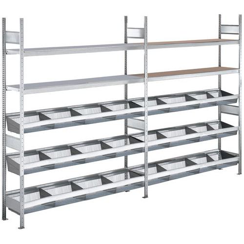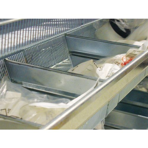 Veelzijdige, industriële stalen stelling. 3 niveaus met mand+ 2 niveaus met legbord (spaanplaat of plaatstaal). Staanders met dubbele perforatie voor gebruik vanaf 2 kanten. Zeer stabiele structuur: geen kruisschoor nodig. Te combineren met andere Easy-Fix Plus-stellingen. Gaasmand uitgerust met 5 tussenschotten. Breedte van het maaswerk: 1 mm. Hoogte mand voor: 12 mm. Hoogte mand achter: 17 mm. Maximale belasting per niveau met manden: 21 kg.