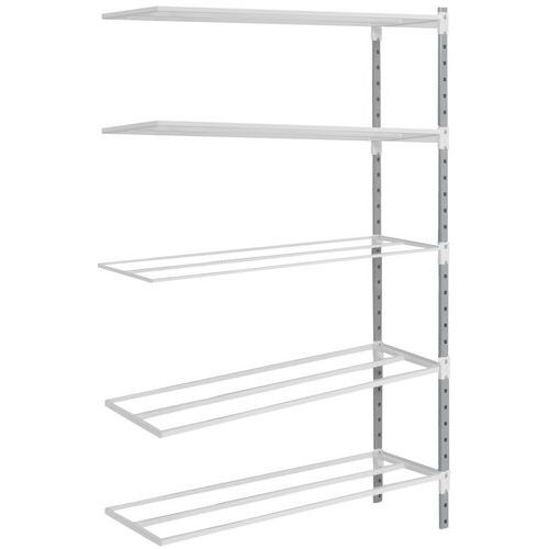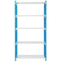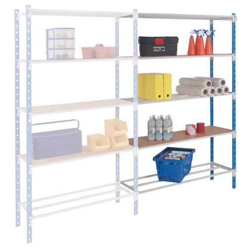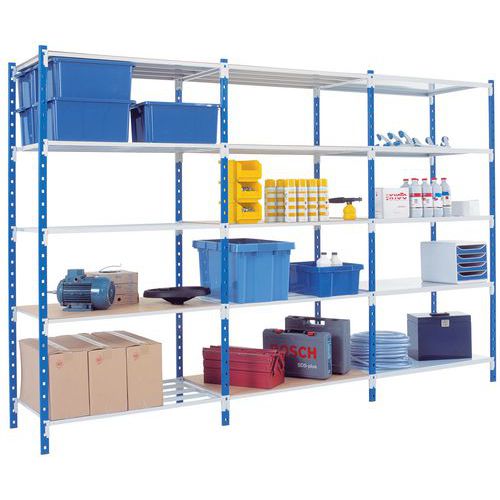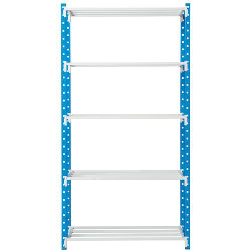 Stevige, stalen magazijnstelling met gelaste buisconstructie. Stabiele stelling zonder kruisstuk, voor enkelzijdige of dubbelzijdige toegang. Staander met C-perforaties van 4x2x1x1,5 mm. Fraaie afwerking met blauwe of grijze epoxylak: stoot- en krasbestendig. Kunststof voet onder staander: goede stabiliteit van het geheel, beschermt de vloer. Buislegbord volledig gelast, met 4 bevestigingsstukken aan de uiteinden. Ideaal voor magazijnen, garages, werkplaatsen, enz.