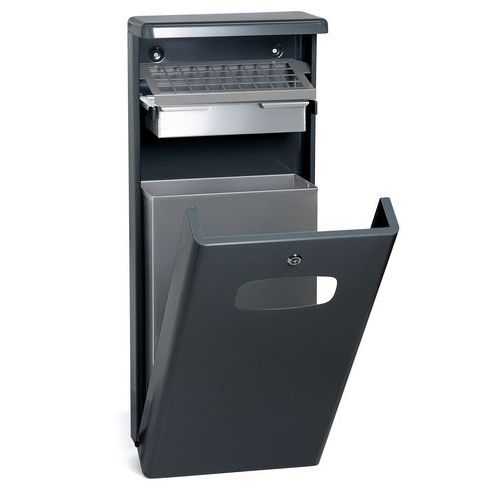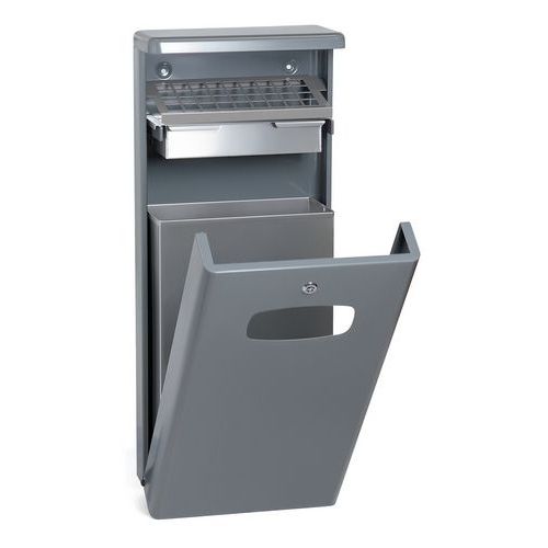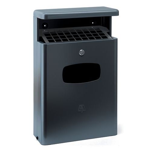 - Aluminium afvalbak en asbak met aluminium binnenbak. Voor wandbevestiging. Afmeting binnenbak 36x18 cm, hoogte 26 cm.