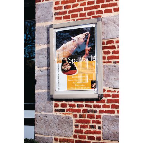 Buitenvitrine, waterdicht en natuurlijk geventileerd. Waterdichtheid verzekerd door een afdichting van elastomeer met luchtcirculatie: voorkomt condensatie. Magnetische achterwand om de documenten eenvoudig te plaatsen met een magneet. Draaideur voor eenvoudige toegang tot de vitrine. Afgeronde hoeken van gespoten grijs polycarbonaat. Voorzien van een veiligheidsslot. Kleur blauw RAL 5000, kleur rood RAL 3011, kleur beige RAL 1019, kleur grijs 7005.