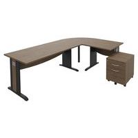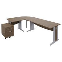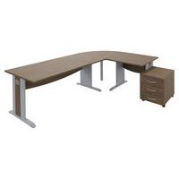 Quatuor-bureauset met hoekelement rechts of links naar keuze bij montage. Dit pakket bestaat uit een recht bureau met een breedte van 16 cm met 1 kabeldoorgang met afsluiter, een hoek van 9°, een recht bureau met een breedte van 8 cm en een verrijdbaar ladeblok. Blad van spaanplaat, dikte 25 mm, gemelamineerd oppervlak, randen met fineer. Blad met hoogte van 72 cm en diepte van 8 cm. Rechte bureaus met frontpaneel. Houten poten in L-vorm met kabeldoorgang onder afneembare behuizing. Voeten met stelpoten. Bureaus monteerklaar geleverd met handleiding. Hoek van 9° om 2 bureaus in hoek met elkaar te verbinden (verbindingsstukken meegeleverd). Voorzien van een in hoogte verstelbare metalen verstevigingspoot. Set monteerklaar geleverd met handleiding. Verrijdbaar ladeblok met 2 of 3 laden, gemonteerd geleverd. BxHxD: 43 x 6 x 56 cm.