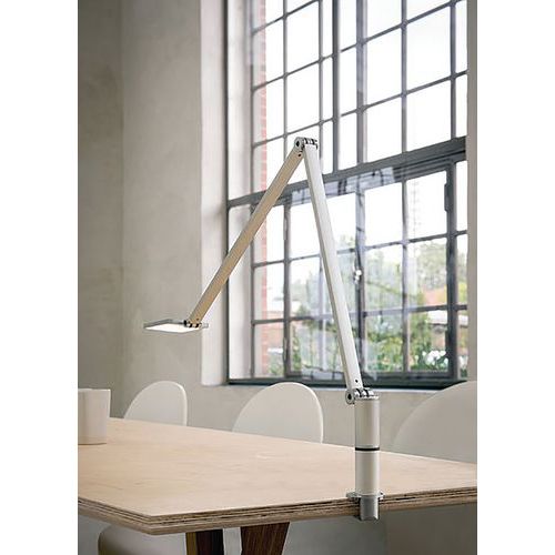 Led-bureaulamp in een zeer slank ontwerp met een elegante zwenkarm van aluminium met 2 elementen en onzichtbare kabeldoorgang. Sokkel in de vorm van een klem. Kabellengte ongeveer 2 m. Lichtkleur: warm wit (kleurtemperatuur 3000 K) Gemaakt in Duitsland