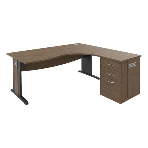 Quatuor-pakket bestaande uit een asymmetrisch bureau met hoekelement rechts en een ladeblok op dezelfde hoogte als het bureau, voor een grote werkruimte