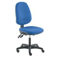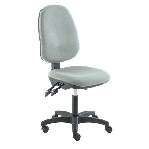 Gestoffeerde stoel met asynchroonmechanisme met drie hefbomen, waardoor rugleuning en zitting traploos verstelbaar zijn en in elke stand geblokkeerd kunnen worden. De stoel heeft een verhoogde lendensteun en een ergonomische, in hoogte verstelbare rugleuning. De zithoogte kan worden afgesteld met een gasveer.
