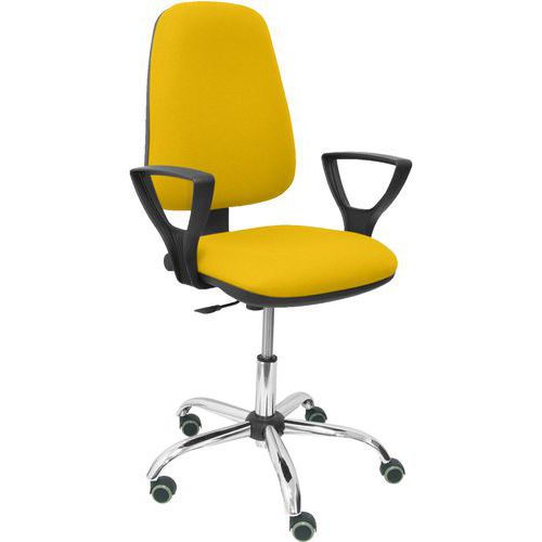 Bureaustoel Sierra CP met vaste armleuningen - Piqueras y crespo. In hoogte verstelbaar met verchroomde gasveer. Permanent contactmechanisme en verstelling van de rugleuning in hoogte, diepte en helling. De zitting en rugleuning zijn bekleed in de stof en kleur van uw keuze. Zeer bestendige verchroomde basis met 5 spaken en een diameter van 60 cm. 360° zwenkwielen met verchroomd gas en parket