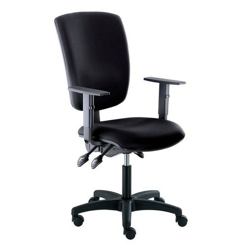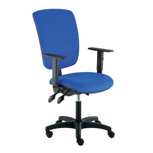 Moderne bureaustoel met hoge rugleuning en asynchroonmechanisme waardoor rugleuning en zitting kantelbaar zijn. De rugleuning kan in hoogte worden afgesteld met een hoog-laag blokkeringssysteem. De zithoogte kan worden afgesteld met een gasveer. Met wielen die geschikt zijn voor een zachte vloer.