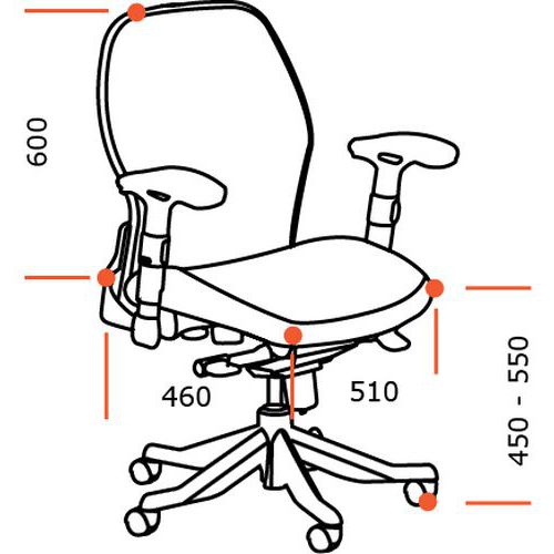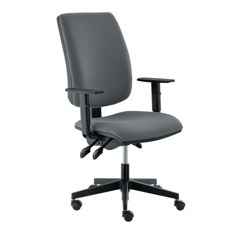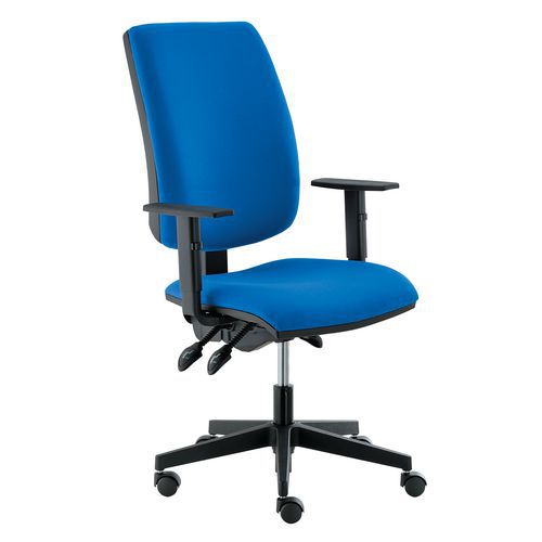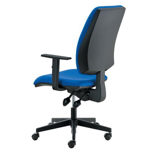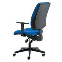 Comfortabele bureaustoel met hoge zitting en rugleuning en een asynchroonmechanisme waardoor rugleuning en zitting kantelbaar zijn. De ergonomische rugleuning kan op meerdere hoogtes worden geblokkeerd.