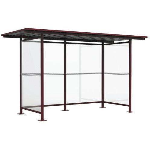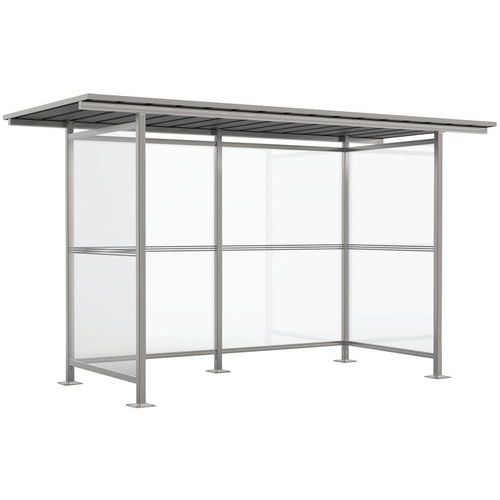 Verkrijgbaar met of zonder bank Uitstekende prijs-kwaliteitverhouding Bouw: Stalen buisconstructie 60 x 60 mm Dwarsbalk aluminiumprofiel Corrosiewerende schroeven Dekking: Trapeza plaat 4.250.35T 4 zijden omlijst door aluminium hoeken Afwerking Thermohardende polyesterverf gebakken op 200°C, ongevoelig voor UV Aankleden Gehard glas sécurit helder dikte 8 mm Bevestiging niet meegeleverd: Gebruik M12/65 ankerschroeven op betonplaat of betonblokken Gebruik M12/120 draadstangen op schoon, vlak asfalt. Niet-verstelbare voeten. Andere RAL's beschikbaar op aanvraag, voor aanpassing Gemaakt in de EU Klantgarantie : 10 jaar