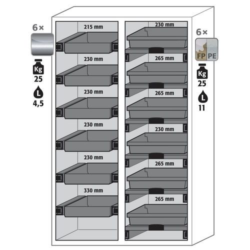 Veilige en gecertificeerde opslag van gevaarlijke ontvlambare en corrosieve stoffen in werkruimtes Stevige constructie aan de buitenzijde van staal met epoxy-coating Volledig sluitmechanisme en beveiligingselementen ter bescherming tegen corrosie, gemonteerd buiten de opslagruimte 2-in-1: twee vakken (verticale verdeling) voor de opslag van gevaarlijke ontvlambare en corrosieve stoffen in één kast Praktisch en veilig: 1 vak met inklapbare deur Handig en zonder risico pakken of opslaan van de containers Altijd gesloten: het automatische mechanisme voor het sluiten van de deur (TSA) is permanent geactiveerd en maakt de deuren na ongeveer 60 seconden vrij, akoestisch en visueel alarm vóór het sluiten Gecontroleerd gebruik: vergrendelbare deuren met geprofileerd slot en cilinderslot Beluchting/ontluchting: geïntegreerd beluchtings- en ventilatiesysteem voor aansluiting (diameter 75 mm) op een technisch luchtafvoersysteem Eenvoudige installatie: geïntegreerde stelvoeten Ventilatie en ventilatie: geïntegreerd ventilatie- en ventilatiesysteem voor aansluiting (diameter 75 mm) op een technisch luchtafvoerapparaat