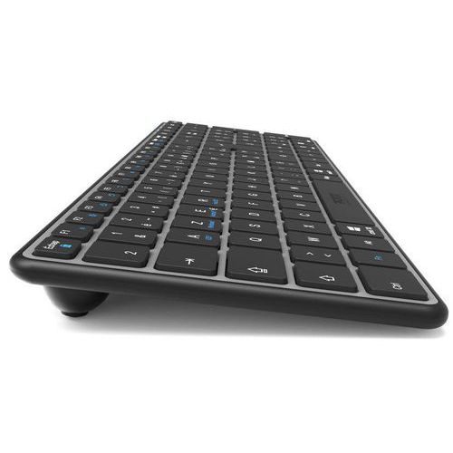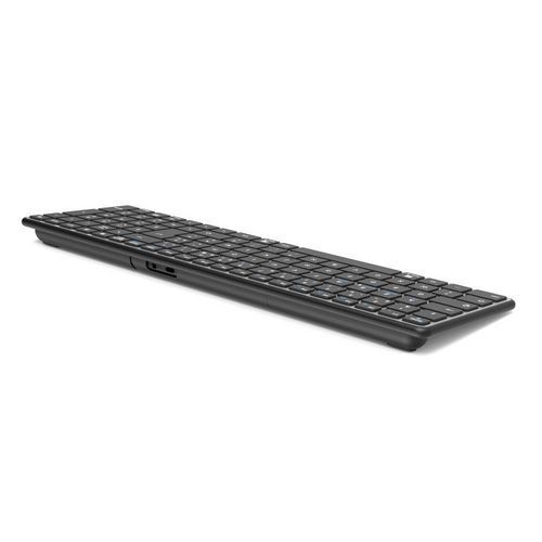 - Compact, oplaadbaar toetsenbord met twee aansluitingen, draadloze compatibiliteit met 2,4 GHz en Bluetooth 5.0 BLE.