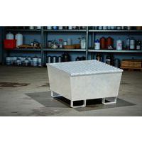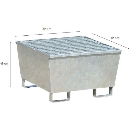 Opvangbak met verwijderbaar rooster van staal, geschikt voor 100% van de inhoud van 1 vat van 220 l. Bestand tegen belasting en opgeslagen producten. Ideaal voor het veilig opslaan van gevaarlijke producten. Deze opvangbak heeft een opvangcapaciteit van 220 liter en is perfect voor het rechtop opslaan van een vat van 220 liter. Extractie van de vloeistof gaat via de pomp. U-poten met een hoogte van 100 mm maken het doorvoeren van vorken eenvoudig en garanderen een optimale stabiliteit.