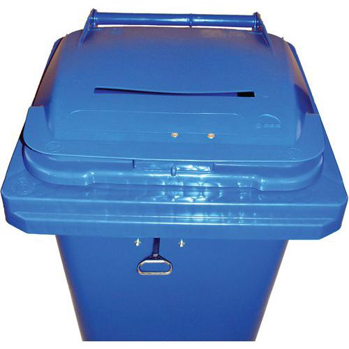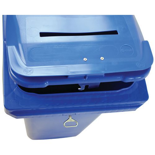 | Productnaam | Container met papiergleuf en slot, Totale inhoud: 120 L, Opening: Gleuf, Materiaal: Kunststof |
