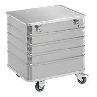 Zeer robuuste containerwagen van aluminium. De boven- en onderranden van de containerwagen zijn verstevigd. Deksel met scharnier met 2 tuimelbevestigingen, vergrendelbaar. Uitgerust met 2 bokwielen en 2 zwenkwielen met rem.