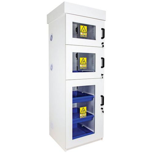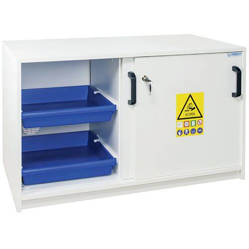 Veiligheidskast met vakken voor het scheiden van zuren en basen. Uitgerust met stelpoten voor hoogteregeling. Opvangbakken van polypropyleen op schuifrails. Constructie bestand tegen de aantasting door corrosieve dampen. Ventilatieopeningen voor aansluiting op een ventilatievoorziening. Conform de aanbevelingen van het INRS.