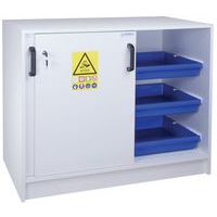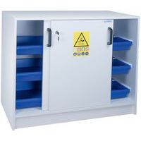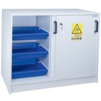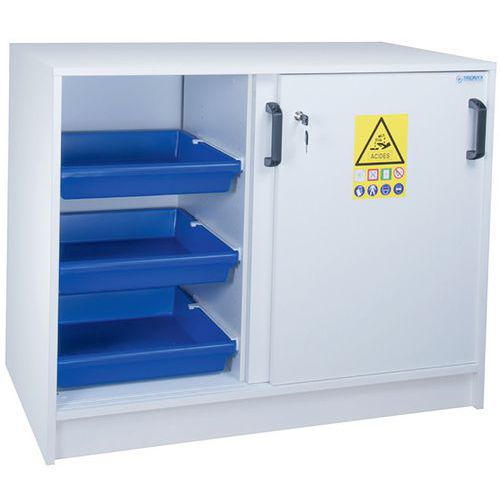 Veiligheidskast met vakken voor het scheiden van zuren en basen. Uitgerust met stelpoten voor hoogteregeling. Opvangbakken van polypropyleen op schuifrails. Constructie bestand tegen de aantasting door corrosieve dampen. Ventilatieopeningen voor aansluiting op een ventilatievoorziening. Conform de aanbevelingen van het INRS.