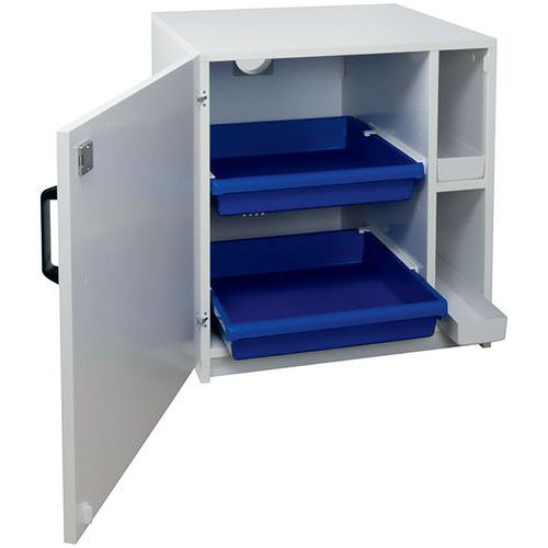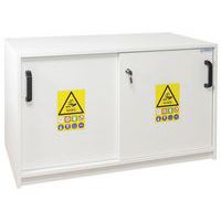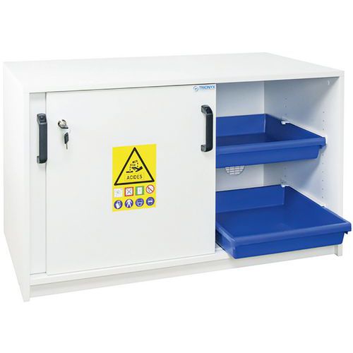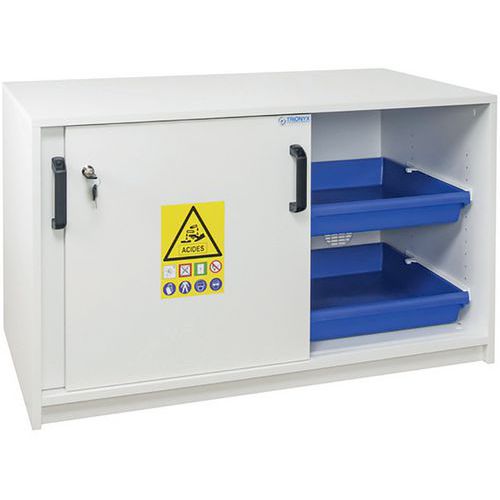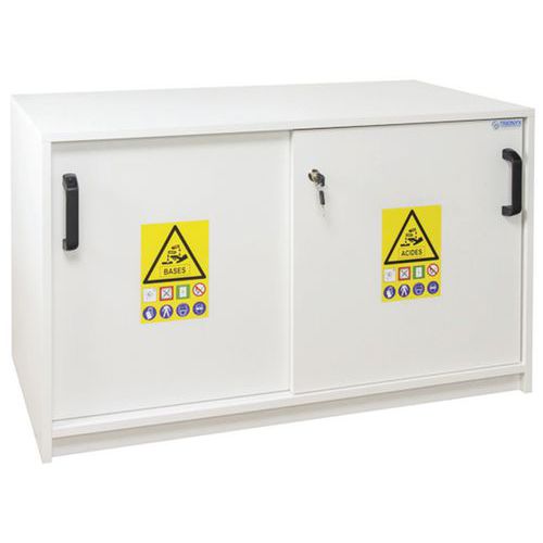 Veiligheidskast met vakken voor het scheiden van zuren en basen. Uitgerust met stelpoten voor hoogteregeling. Opvangbakken van polypropyleen op schuifrails. Constructie bestand tegen de aantasting door corrosieve dampen. Ventilatieopeningen voor aansluiting op een ventilatievoorziening. Conform de aanbevelingen van het INRS.