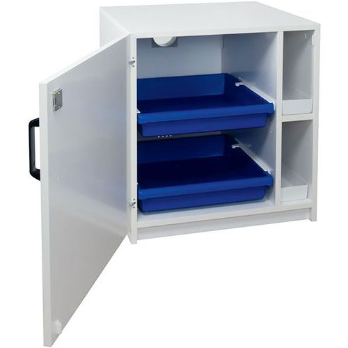 Veiligheidskast met vakken voor het scheiden van zuren en basen. Uitgerust met stelpoten voor hoogteregeling. Opvangbakken van polypropyleen op schuifrails. Constructie bestand tegen de aantasting door corrosieve dampen. Ventilatieopeningen voor aansluiting op een ventilatievoorziening. Conform de aanbevelingen van het INRS. Gemaakt in de EU