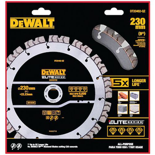| Productnaam | Diamantblad gesegmenteerd universeel, Asgat Ø: 22.23 mm, Diameter Ø: 230 mm, Max. rotatiesnelheid: 6.6 omw/min |