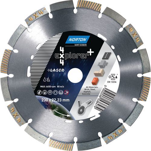 | Productnaam | Diamantschijf 4 x 4 Explorer, Asgat Ø: 25.4 mm, Ø: 300 mm, Voor materiaal: Gewapend beton, betonproducten |