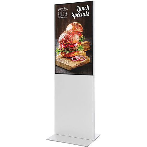 Digitale advertentie totem met perfecte pasvorm scherm. Elegant, frameloos design. Behuizing standaard verkrijgbaar in zwart of wit. Stevige voet van 8 mm staalplaat voor optimale stabiliteit. Gemaakt in de EU Klantgarantie : 2 jaar
