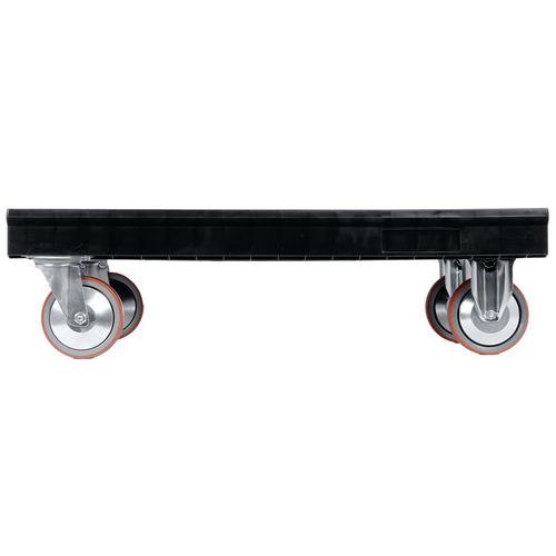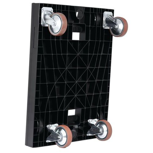 Stabiel en hoog draagvermogen. Uitgerust met 2 vaste wielen en 2 zwenkwielen. Geruisloos en slijtvast oppervlak. Met inkepingen aan de bovenkant van het plateau voor het stapelen van de rolsteunen. Uiterst robuuste dolly. Ruimtebesparend: leeg stapelbaar.