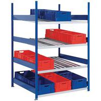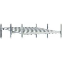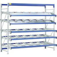 - Dynamische stalen stelling met schuine legborden, geschikt voor FIFO-opslag (first in/first out).