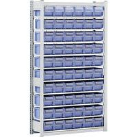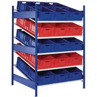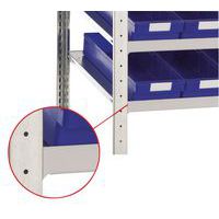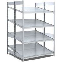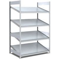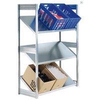 - Lichte stelling van gegalvaniseerd staal met schuine legborden en een stopper aan de voorkant. Uitstekende zichtbaarheid van de opgeslagen goederen.