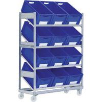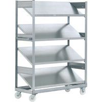 - Lichte verrijdbare stelling van gegalvaniseerd staal met schuine legborden en een stopper aan de voorkant. Uitstekende zichtbaarheid van de opgeslagen goederen.