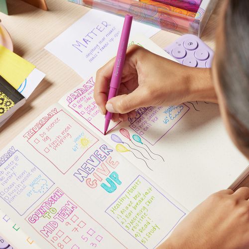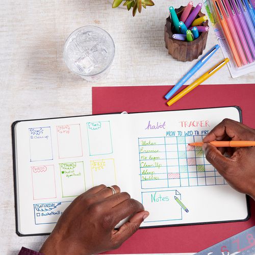 Kleurenviltstiften Paper Mate® Flair met middeldikke punt (0,7 mm), turquoise inkt, doos van 12. Inkt op waterbasis die niet door het papier dringt, zodat wat u aan de achterkant hebt geschreven, intact blijft. Vlekt en verkleurt niet, voor een fraaie en nette pagina. Klantgarantie : Wettelijke garantie