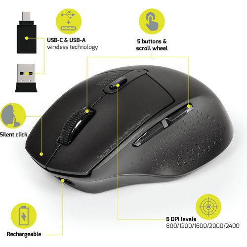 | Productnaam | Draadloze en oplaadbare professionele Bluetooth-muis voor links- en rechtshandigen, Type sensor: Optische |