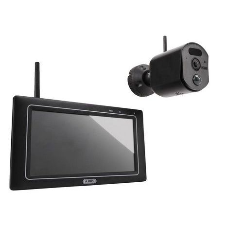 Draadloze set van bewakingscamera en draagbare monitor met touchscreen.