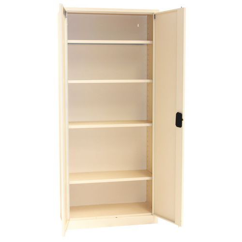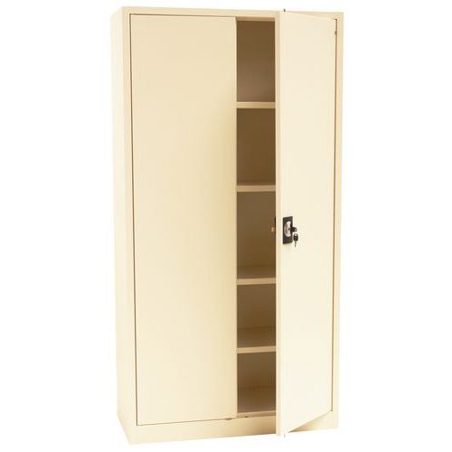 Draaideurkast voorzien van zeer stevige, gewapende wand. 4 verstelbare legborden met een draagvermogen van ongeveer 60 kg. Kast te vergrendelen met een driepunts cilinderslot.