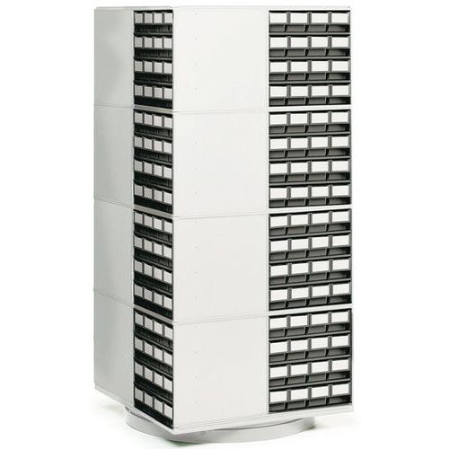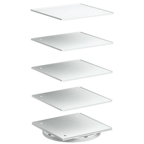 Draaisteun voor tafel ESD. Deze steun is geschikt voor twee opslagkasten naar keuze, hoogte 290 mm en 550 mm, rug aan rug. De kasten moeten afzonderlijk worden besteld. Het geheel bestaat uit een basis op kogellagers en een bodemplaat. Geleverd met een aansluitsnoer voor aarding. Maximale belasting: 50 kg.