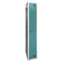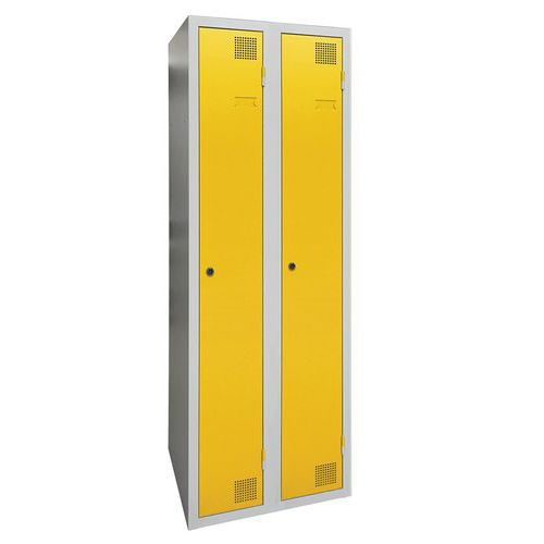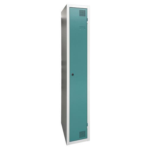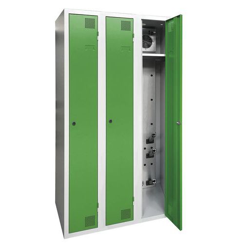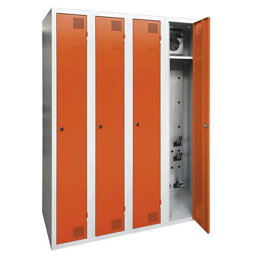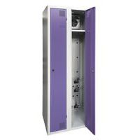 Droogkast met hete lucht, zeer robuust, met opbergvak en hangvakken. Behuizing en deur van elektroverzinkt plaatstaal, met verstevigd uiteinde over de gehele hoogte. Comfortabel in gebruik dankzij het scharniersysteem dat een openingshoek van 180° biedt. Hygiënisch met een dubbele ventilatieopening aan de voorkant, boven- en onderzijde van de garderobekast. Fraaie afwerking van epoxylak, verkrijgbaar in een ruim assortiment aantrekkelijke kleuren. 2 sluitingen naar keuze: sleutelslot of overval voor hangslot. Etikethouder op deur. Product gefabriceerd in Frankrijk.
