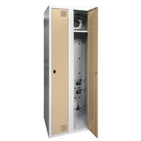 Droogkast met hete lucht, zeer robuust, met opbergvak en hangvakken. Behuizing en deur van elektroverzinkt plaatstaal, met verstevigd uiteinde over de gehele hoogte. Comfortabel in gebruik dankzij het scharniersysteem dat een openingshoek van 180° biedt. Hygiënisch met een dubbele ventilatieopening aan de voorkant, boven- en onderzijde van de garderobekast. Fraaie afwerking van epoxylak, verkrijgbaar in een ruim assortiment aantrekkelijke kleuren. 2 sluitingen naar keuze: sleutelslot of overval voor hangslot. Etikethouder op deur. Product gefabriceerd in Frankrijk.
