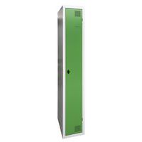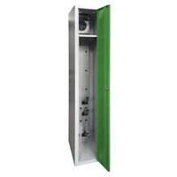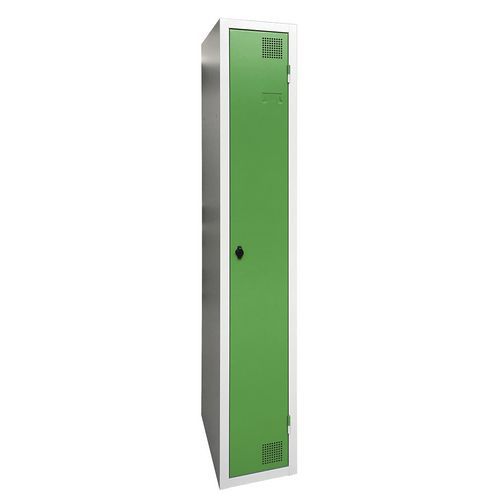 Droogkast met hete lucht, zeer robuust, met opbergvak en hangvakken. Behuizing en deur van elektroverzinkt plaatstaal, met verstevigd uiteinde over de gehele hoogte. Comfortabel in gebruik dankzij het scharniersysteem dat een openingshoek van 180° biedt. Hygiënisch met een dubbele ventilatieopening aan de voorkant, boven- en onderzijde van de garderobekast. Fraaie afwerking van epoxylak, verkrijgbaar in een ruim assortiment aantrekkelijke kleuren. 2 sluitingen naar keuze: sleutelslot of overval voor hangslot. Etikethouder op deur. Product gefabriceerd in Frankrijk.