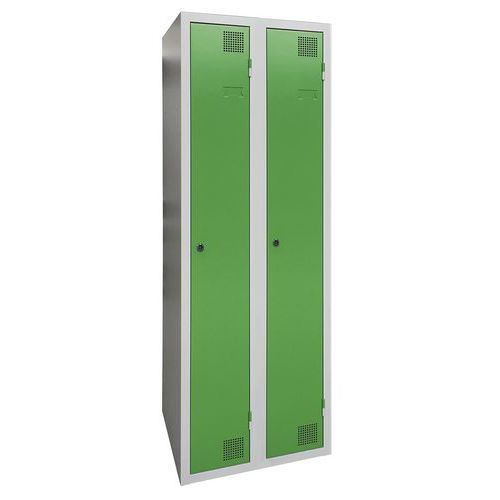 Droogkast met hete lucht, zeer robuust, met opbergvak en hangvakken. Behuizing en deur van elektroverzinkt plaatstaal, met verstevigd uiteinde over de gehele hoogte. Comfortabel in gebruik dankzij het scharniersysteem dat een openingshoek van 180° biedt. Hygiënisch met een dubbele ventilatieopening aan de voorkant, boven- en onderzijde van de garderobekast. Fraaie afwerking van epoxylak, verkrijgbaar in een ruim assortiment aantrekkelijke kleuren. 2 sluitingen naar keuze: sleutelslot of overval voor hangslot. Etikethouder op deur. Product gefabriceerd in Frankrijk.