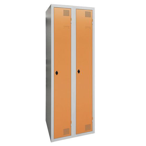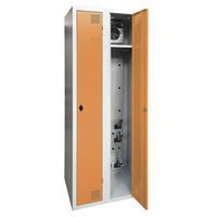 Droogkast met hete lucht, zeer robuust, met opbergvak en hangvakken. Behuizing en deur van elektroverzinkt plaatstaal, met verstevigd uiteinde over de gehele hoogte. Comfortabel in gebruik dankzij het scharniersysteem dat een openingshoek van 180° biedt. Hygiënisch met een dubbele ventilatieopening aan de voorkant, boven- en onderzijde van de garderobekast. Fraaie afwerking van epoxylak, verkrijgbaar in een ruim assortiment aantrekkelijke kleuren. 2 sluitingen naar keuze: sleutelslot of overval voor hangslot. Etikethouder op deur. Product gefabriceerd in Frankrijk.
